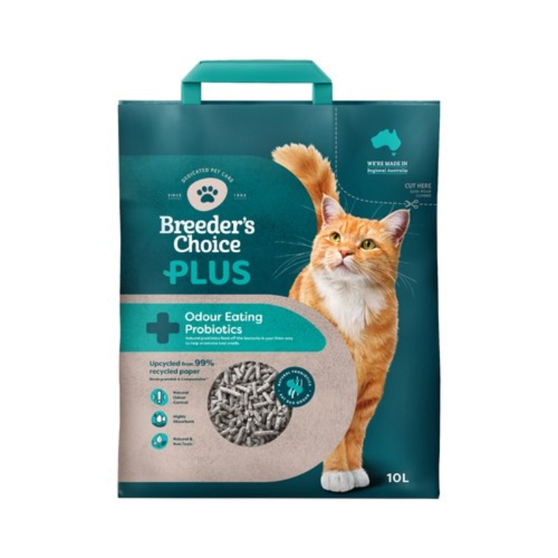 Breeders Choice PLUS Probiotic Litter is made from natural materials that are 99% recycled paper. Carefully crafted with odour-controlling ingredients, Breeders Choice offers a more hygienic and fresh solution by infusing probiotics into the litter. These probiotics work to feed on the bacteria left behind in the tray, reducing any odour and keeping the area cleaner.Made in Australia, the litter pellets are flat in texture and shape, allowing for maximum comfort for your cats paws. The highly-absorbent pellets are also lightweight and easy to handle, and contain no chemicals or additives.