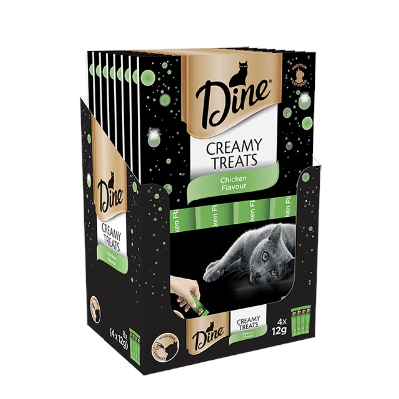 With an irresistible creamy texture and delicious flavours from quality ingredients, Dine Creamy Treats are designed to be squeezed by hand straight from the sachet for a special treat your cat will love.