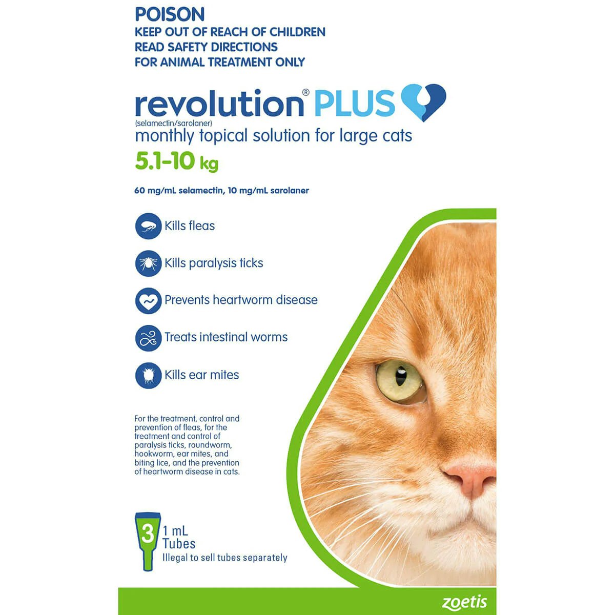 REVOLUTION PLUS is a simple-to-apply, quick-drying, small-volume, monthly topical parasiticides for the treatment, control and prevention of fleas, for the treatment and control of paralysis ticks, roundworm, hookworm, ear mites and biting lice, and the prevention of heartworm disease in cats.