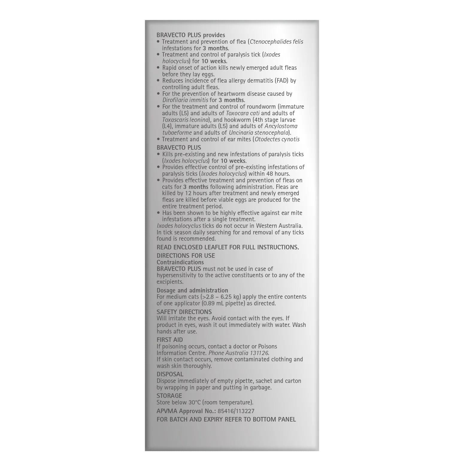 Bravecto Plus For Large Cats Effectively Attacks Fleas Ticks Heartworm Roundworm Hookworm And Ear Mites500 MG FLURALANER and 25 MG MOXIDECTIN Spot-on Solution for Large Cats Active Constituents280 mg/m L FLURALANER14 mg/m L MOXIDECTINAlso contains: 339 mg/m L DIMETHYLACETAMIDEIndications Treatment and prevention of flea (Ctenocephalides felis) infestations for 3 months Treatment and control of paralysis tick (Ixodes holocyclus) for 10 weeks Rapid onset of action kills newly emerged adult fleas before they lay eggs Reduces incidence of flea allergy dermatitis (FAD) by controlling adult fleas Prevention of heartworm disease caused by Dirofilaria immitis for 3 months Treatment and control of roundworm (immature adults (L5) and adults of Toxocara cati and adults of Toxascaris leonina), and hookworm (4th stage larvae (L4), immature adults (L5) and adults of Ancylostoma tubaeforme and adults of Uncinaria stenocephala Treatment and control of ear mites (Otodectes cynotis)