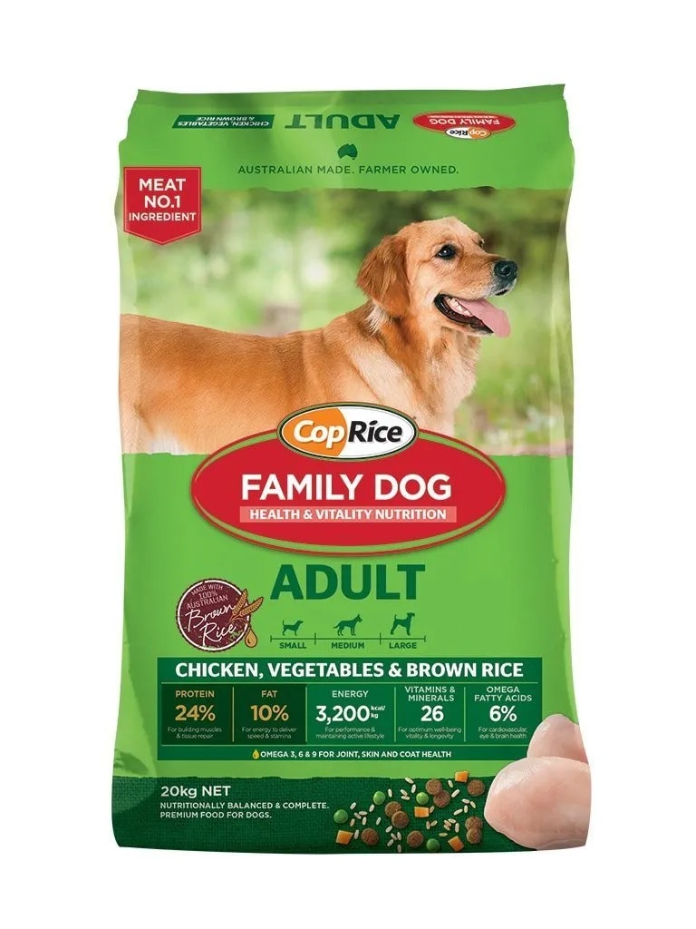 100% Australian grown rice and locally sourced chicken are blended with wholegrains, vegetables, flavoursome herbs and a tailored mix of vitamins and minerals. This provides a nutritionally complete diet which nourishes from the inside out, to help maintain your companions fitness, overall body condition, healthy skin and shiny coat.Suitable for all breeds of dogs, it is formulated using the highest quality ingredients and contains no artificial colours, flavours or preservatives.