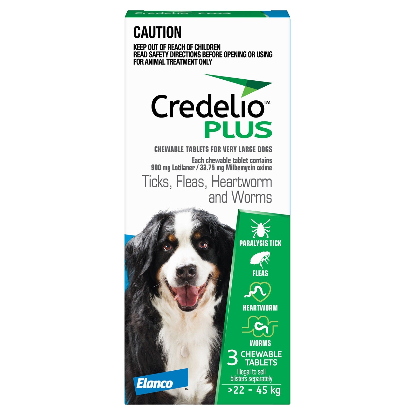Credelio Plus For Dogs Combats Ticks Fleas Heartworm And Intestinal WormsEach chewable tablet contains:900 mg Lotilaner33.75 mg Milbemycin oximeIndicationsProtects dogs against ticks, fleas, heartworm, and intestinal wormsTicks ✠treats and controls:Paralysis ticks (Ixodes holocyclus)Brown Dog ticks (Rhipicephalus sanguineus)Bush ticks (Haemaphysalis longicornis)Provides protection against ticks for 1 monthFleasTreats flea (Ctenocephalides felis) infestations for 1 monthControls flea allergy dermatitis (FAD) by controlling adult fleasKills fleas before they have a chance to lay eggsPrevents flea tapeworm infestationsWorms ✠treats and controls:Roundworms (adult and larval Toxocara canis, adult Toxacaris leonine)Hookworm (Ancylostoma caninum, Ancylostoma braziliense, Ancylostoma ceylanicum: larval (L4), immature adult (L5) and adult)Whipworm (adult Trichuris vulpis)HeartwormPrevents heartworm (Dirofilaria immitis) disease BenefitsPalatable, chewable flavoured tabletsProvides protection for 1 month