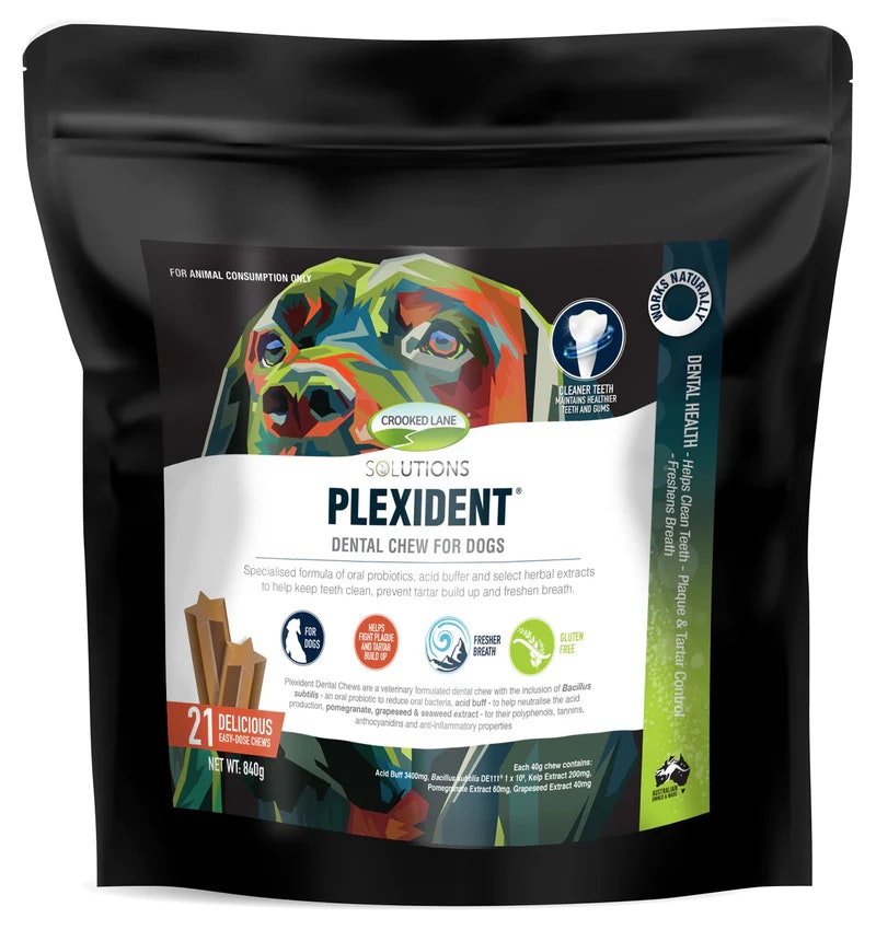 Plexident Dental Chews are a specialised formula of oral probiotics, acid buffer and select herbal extracts to help keep teeth clean, prevent tartar build up and freshen breath.Used daily, the unique combination of Plexident Dental Chews abrasive texture and all-natural active ingredients, will help to keep teeth clean, freshen breath and reduce plaque and tartar build up in dogs.Plexident Dental Chews are free from artificial flavours and colours.100% Australian Owned and Made