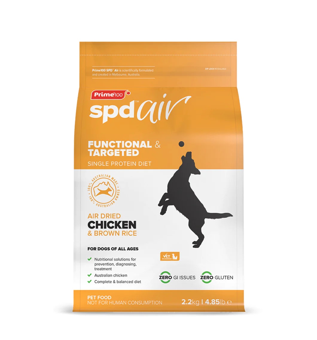 Prime 100 SPD Single Protein Diet Air Dried Chicken And Brown Rice All Life Stages Dry Dog Food Promotes Optimal Health And WellbeingAn Australian-made and owned, complete and balanced diet for dogs of all ages including puppies, adults, seniors, and active dogsA premium, grain-free, single meat protein formula, air-dried to perfectionVeterinary approvedFunctional & Targeted IngredientsMade with functional, fresh ingredients, including Australian chicken, carrot, brown rice, apple, omega oils, and flaxseed oil100% natural and contains no artificial food colourings, additives, or preservativesNo GMOs, gluten, wheat, corn, or barleyKey Health Indications*The precise formula may assist with health conditions including: Food Aversion, Cachexia, Bowel Disease, Sensitive Stomach, and InappentenceSingle Protein Diet (SPD)The single meat formula range is great for dogs with sensitives or allergies to specific meat sources Air DriedA controlled dehydration process preserves the nutrients and rich flavour of the ingredients The air-drying procedure removes moisture, along with undesirable particles from the food to allow the body to absorb the finest nutrients for optimal healthSlow-drying at a low temperature enhances the bioavailability of the ingredients - nutrients are often lost when processed at high temperatures Skin And Coat HealthHigh in omega 3 and 6 fatty acids from flaxseed oil and sunflower oil for healthy skin and a shiny coatSuitable For Underweight or Inappetent DogsThe high palatability formula appeals to dogs with food aversion or inappetenceSupports dogs to achieve a healthy body weightDigestive HealthContains natural prebiotics and added postbiotics to promote a healthy gut microbiomeBrown rice is a great source of natural fibre to support digestionFree from wheat gluten for sensitive stomachs Joint HealthContains chondroitin, glucosamine, and omega fatty acids - shown to promote strong joints and good mobility