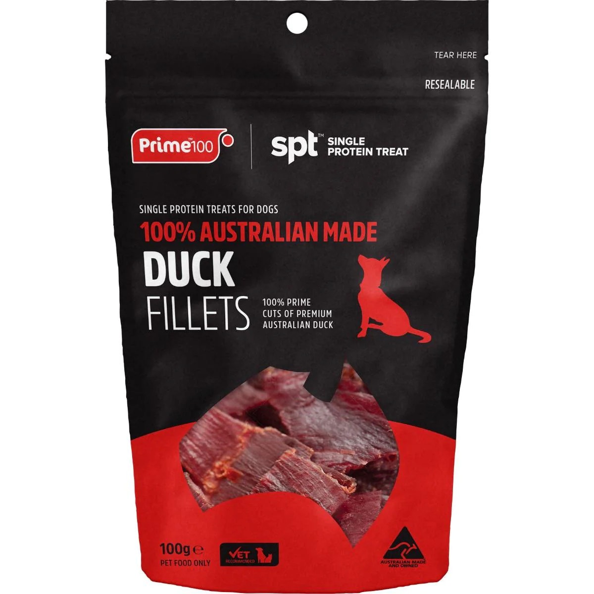 Prime100 SPTâž 100% Australian Made Duck Fillets are a new hypo-allergenic treat for dogs or cats. Every Duck fillet contains 100% premium cuts of Duck which provides a rich single source of an advanced novel protein. 100% of this product is sourced within Australia and contain no cheap fillers.