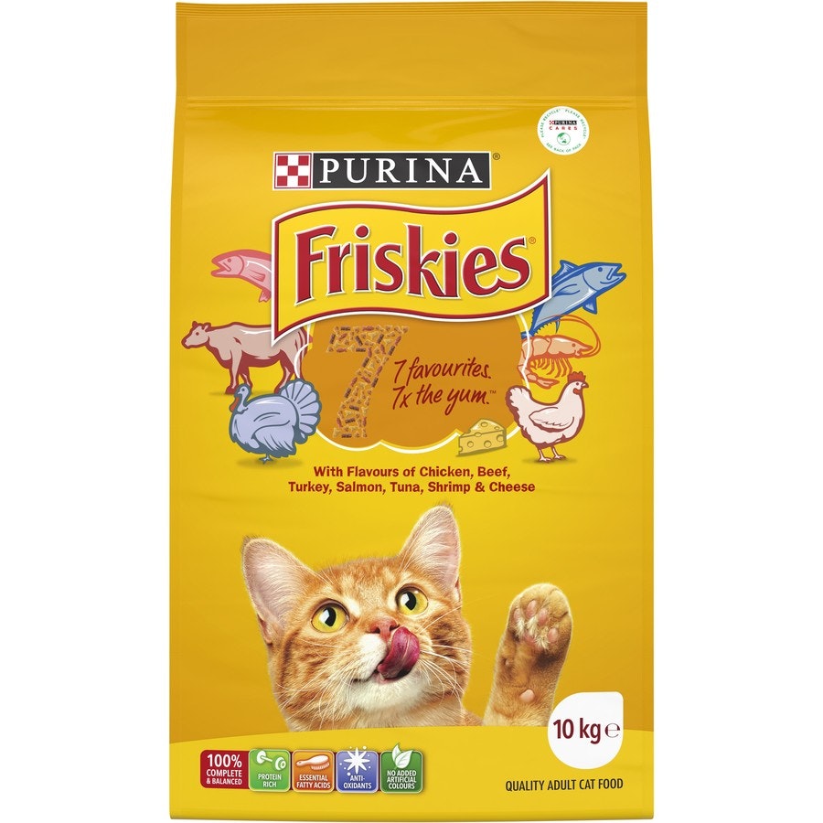 FRISKIES 7 is made up of kibble biscuits in a variety of meat and seafood shapes with the flavours of chicken, beef, turkey, salmon, tuna, shrimp and cheese. 7 of your cats favourite flavours for 7 x the yum. It will bowl your cat over.