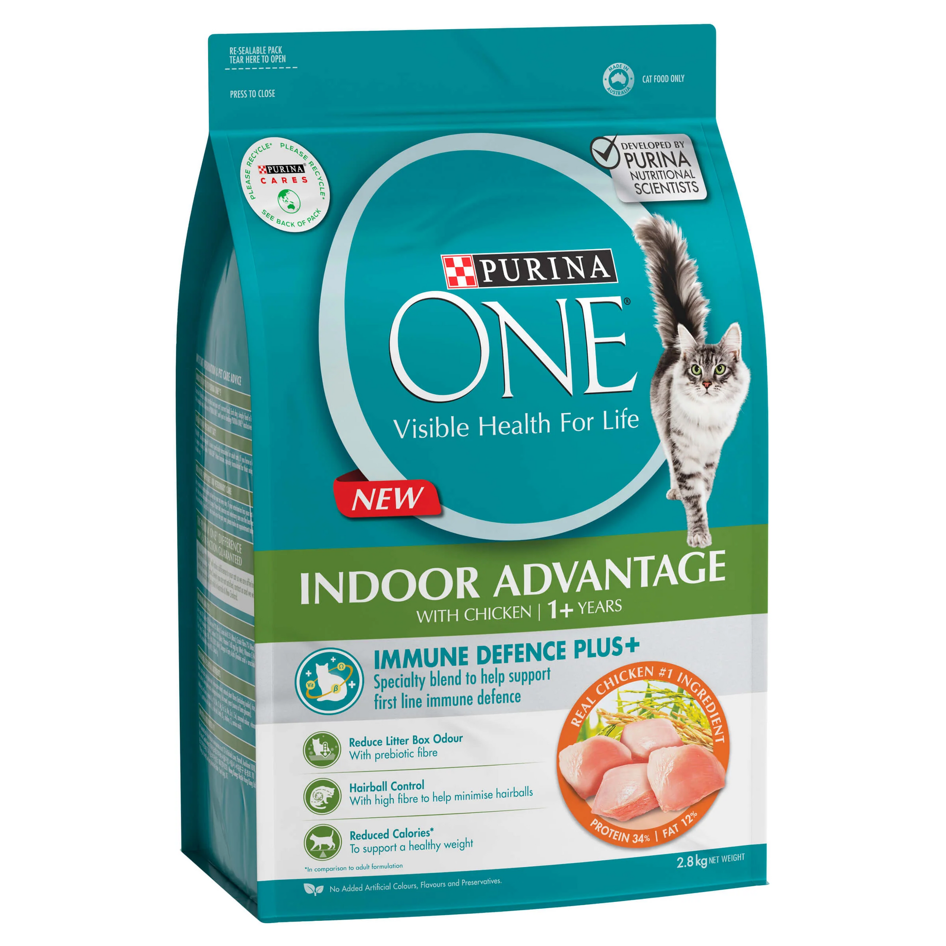 PURINA ONE INDOOR ADVANTAGE with IMMUNE DEFENCE PLUS+ has been specially formulated with beta glucans, vitamin C & E and omega 3 & 6 fatty acids. Working in parallel this blend helps support first line immune defence for your cat: