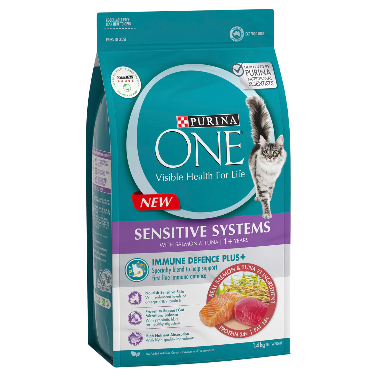 PURINA ONE Sensitive Systems Dry Cat Food with Salmon & Tuna is specially formulated for cats with sensitive skin and stomach. Contains real salmon & tuna and prebiotic fibre to promote easy digestion and omega 3 & vitamin E to nourish sensitive skin.