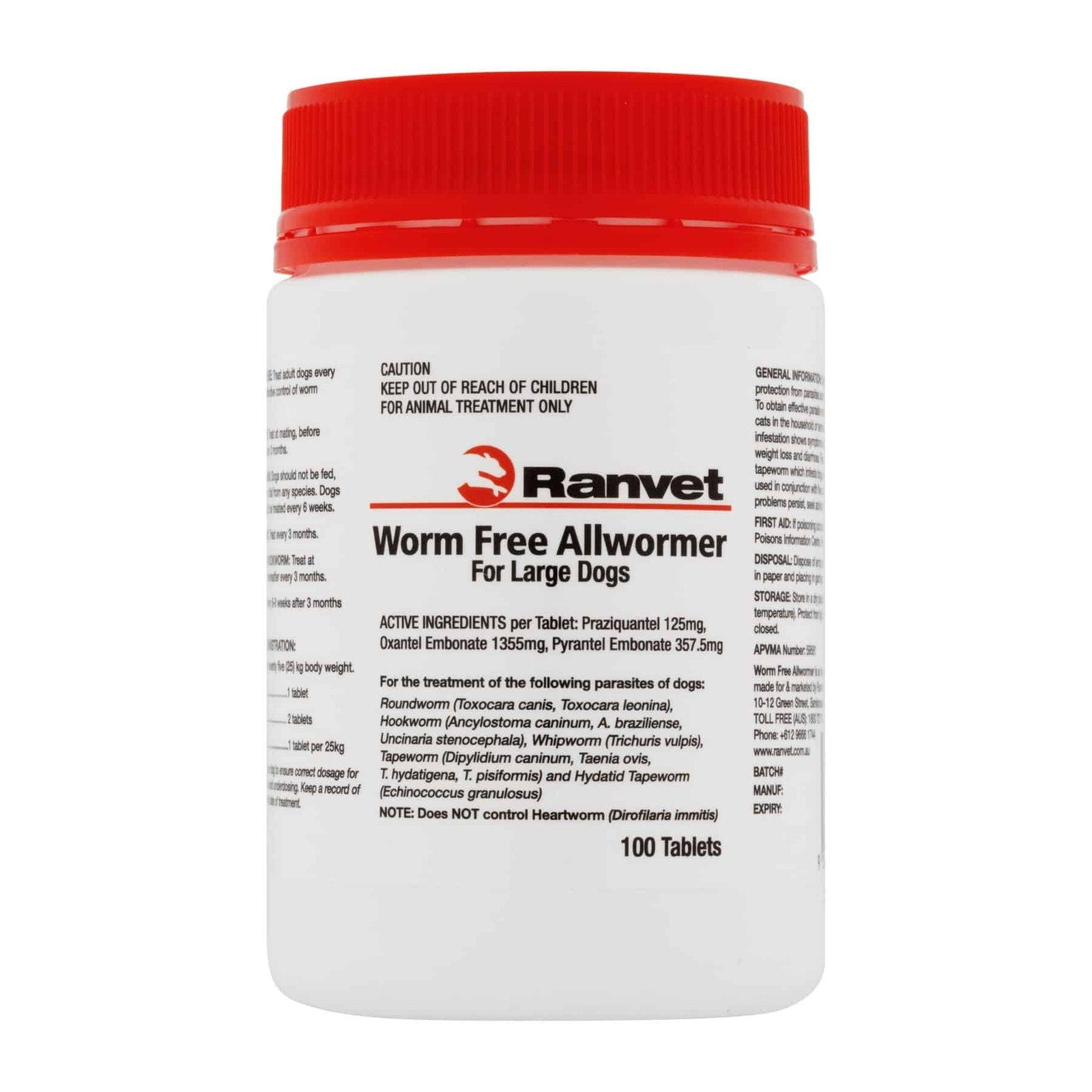 Features Treats Roundworm, Hookworm, Whipworm, Tapeworms and Hydatid Tapeworm. It does not control Heartworm.Ranvet WORM FREE ALLWORMER is suitable for pregnant bitches, which should be treated at mating, before whelping, and then every 3 months.BenefitsProven safe drug combinations are effective because they attack internal parasites at several stages of worm physiology, usually causing worm paralysis and death, without harming your pet.