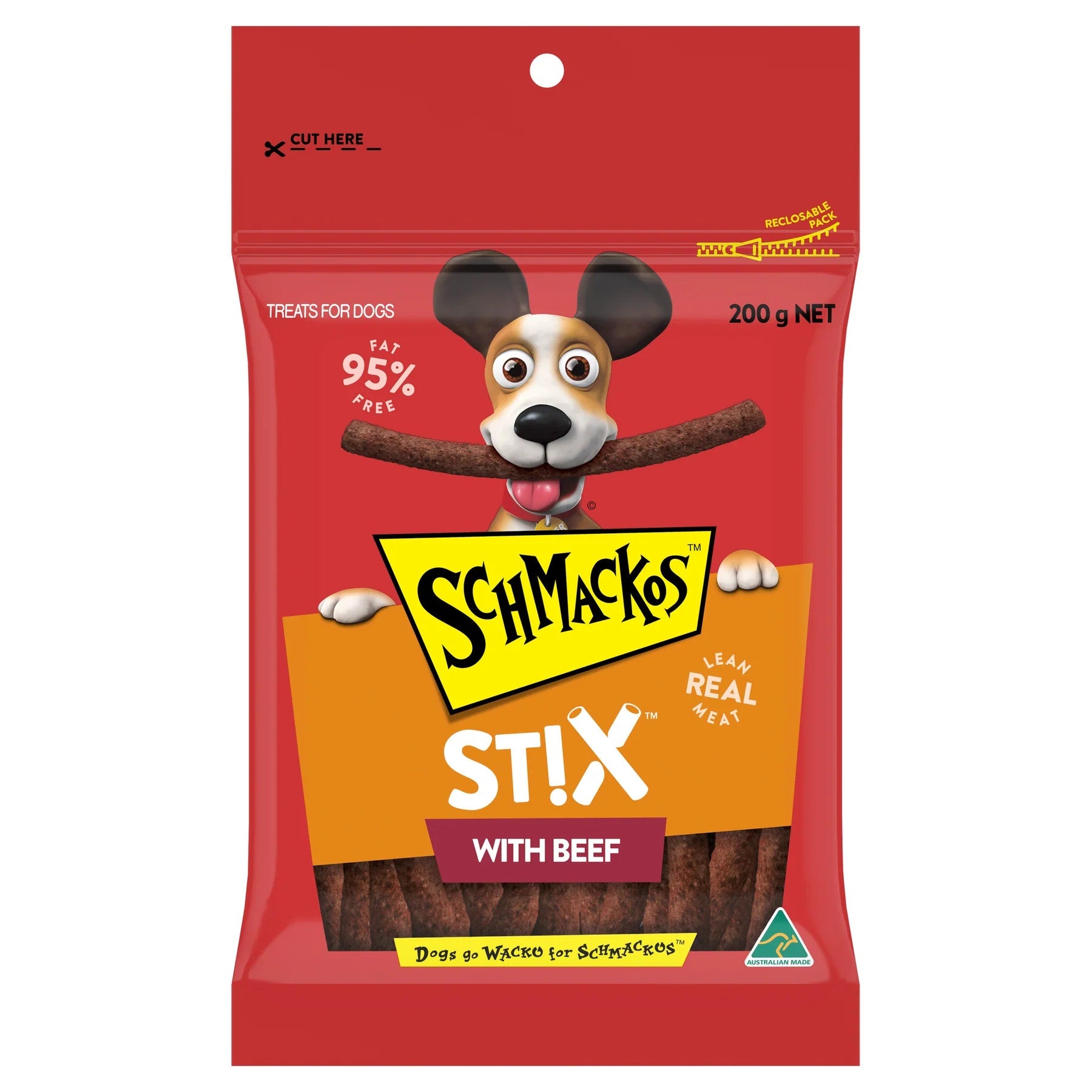 SCHMACKOSâž STIXâž treats are baked then air dried to seal in the delicious flavour of real beef.