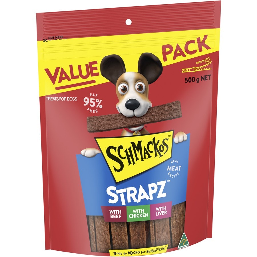 SCHMACKOS STRAPZ treats are baked then air dried to seal in the delicious flavour of real beef.