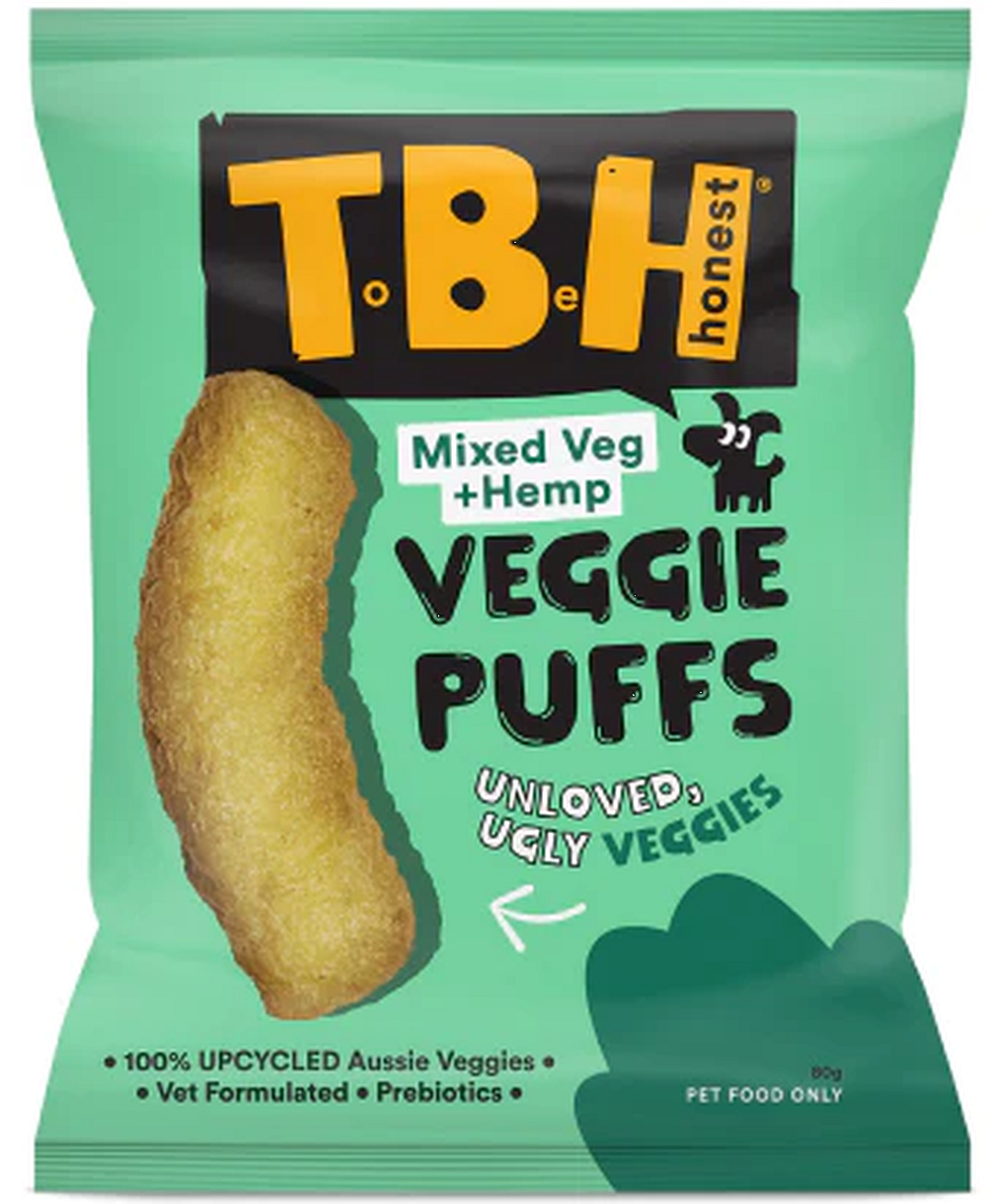 Meet TBH Veggie Puff Dog Treats! It stands for To Be Honest - and TBH, these are dog treats with a difference. Actually, theyre dog treats with a lot of differences. Like the way theyre made right here in Australia, from human-grade, locally sourced ingredients.