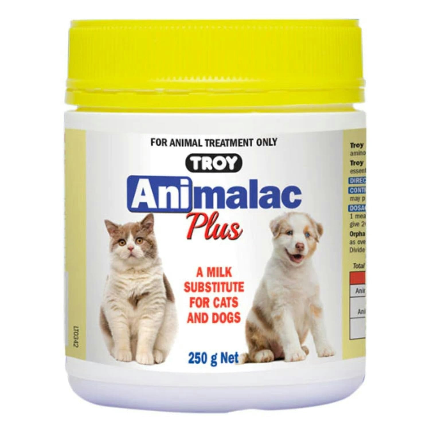 Troy plus milk powder is a balanced blend of proteins, fats, carbohydrates, vitamins, minerals and amino acids formulated to meet the nutritional needs of young and debilitated animals.Feed supplement for orphan pups and kittensContains fats, proteins, carbohydrates, vitamins, minerals and amino acidsSuitable for young and debilitated animals