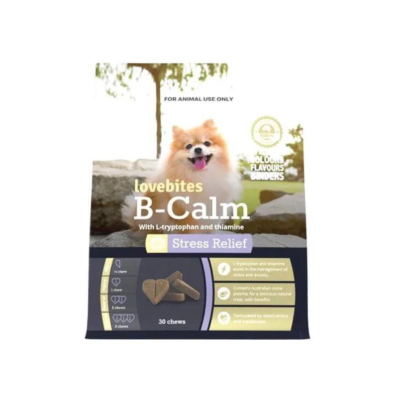 Lovebites B-Calm Chews contain L-Tryptophan and thiamine to assist in the management and reduction of stress and anxiety in companion canines. Non-drowsy, non-sedative action helps combat anxiety and stress naturally. Flavoured with fresh Australian lamb, chicken and kangaroo, with no artificial binders, colours or flavours. Grain free.