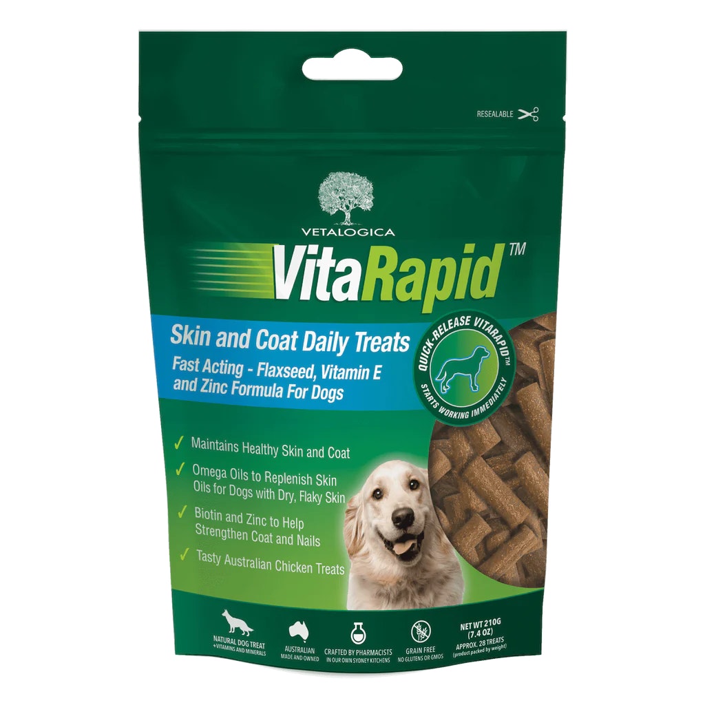 Vetalogica VitaRapid for Dogs Skin & Coat Daily Treats Promote Healthy Skin And A Shiny CoatQuick-release OMEGADERMâž Skin/Coat Care technology for pets is expertly formulated with natural ingredientsConcentrated levels of omega oils, vitamins, minerals and antioxidants are in a unique, proprietary blend which provides advanced skin care solutions for dogsConvenient, delicious treats make dosing even easier with the added benefit of being fast actingVetalogicas world exclusive OMEGADERMâž technology is the result of careful research and development by Scientists, Chemists, Veterinarians and flavour expertsDesigned for dogs with dry, flaky skinOmega oils help to replenish the skin and restore hydration Biotin and zinc maintain the strength of the coat and nails Grain freeTasty chicken flavourAustralian made and owned