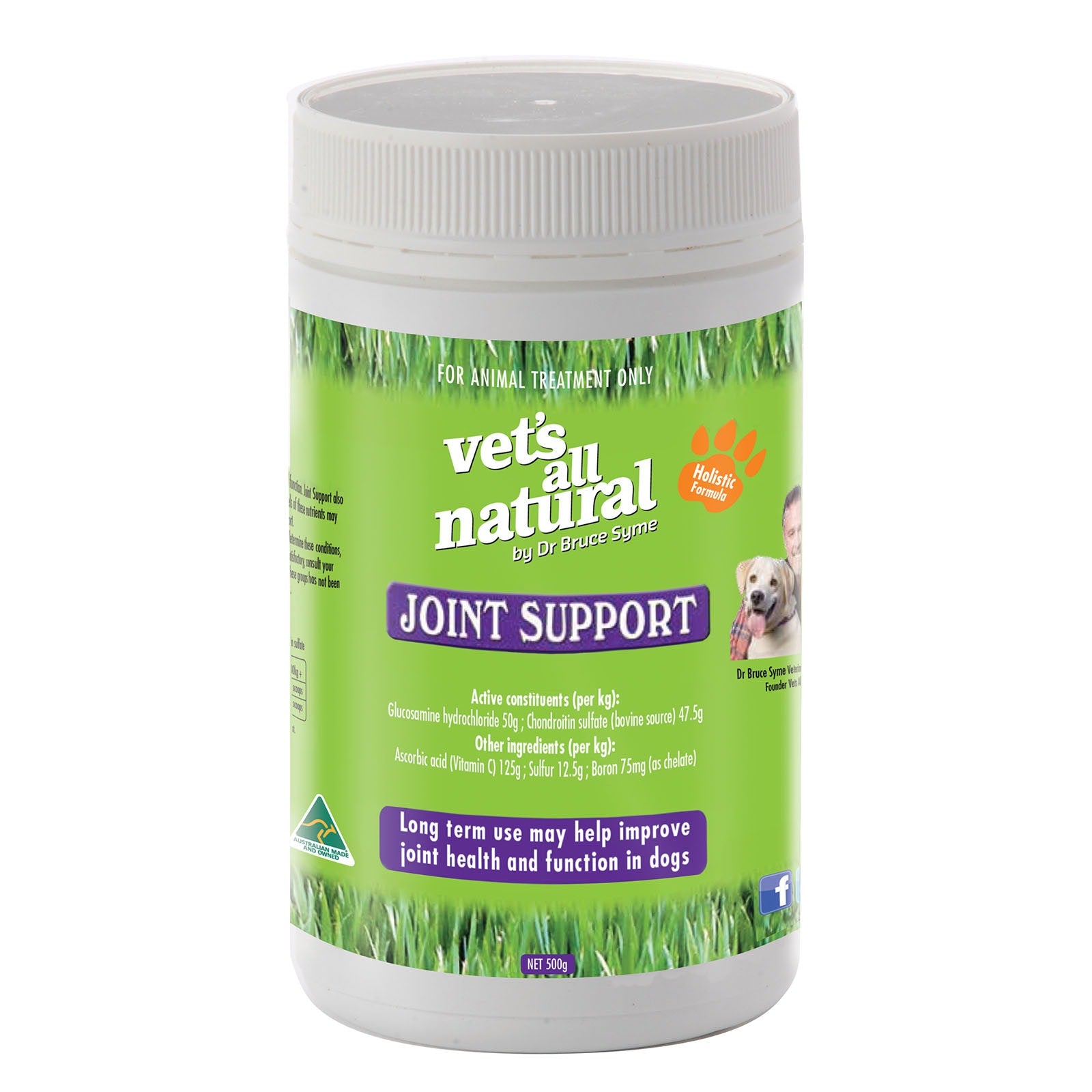 Vets All Natural Joint Support Powder Nutritional Supplement For Dogs Contains Natural Ingredients To Help Keep Joints Strong And MobileActive constituents (per kg)Glucosamine hydrochloride 50g; Chondroitin sulphate (bovine source) 47.5gIndicationsA joint support supplement to help improve joint health and function in dogs with long term useScientifically formulated by Dr Bruce Syme, a leading veterinarian, to improve your dogs joint health and functionLong term use may help improve joint health and functionContains boron, calcium, magnesium, fish oil, ginger, vitamin C, and sulphur to supplement diets where levels of these nutrients may not be substantialThe ingredients are formulated to provide broad, holistic skeletal supportAustralian made