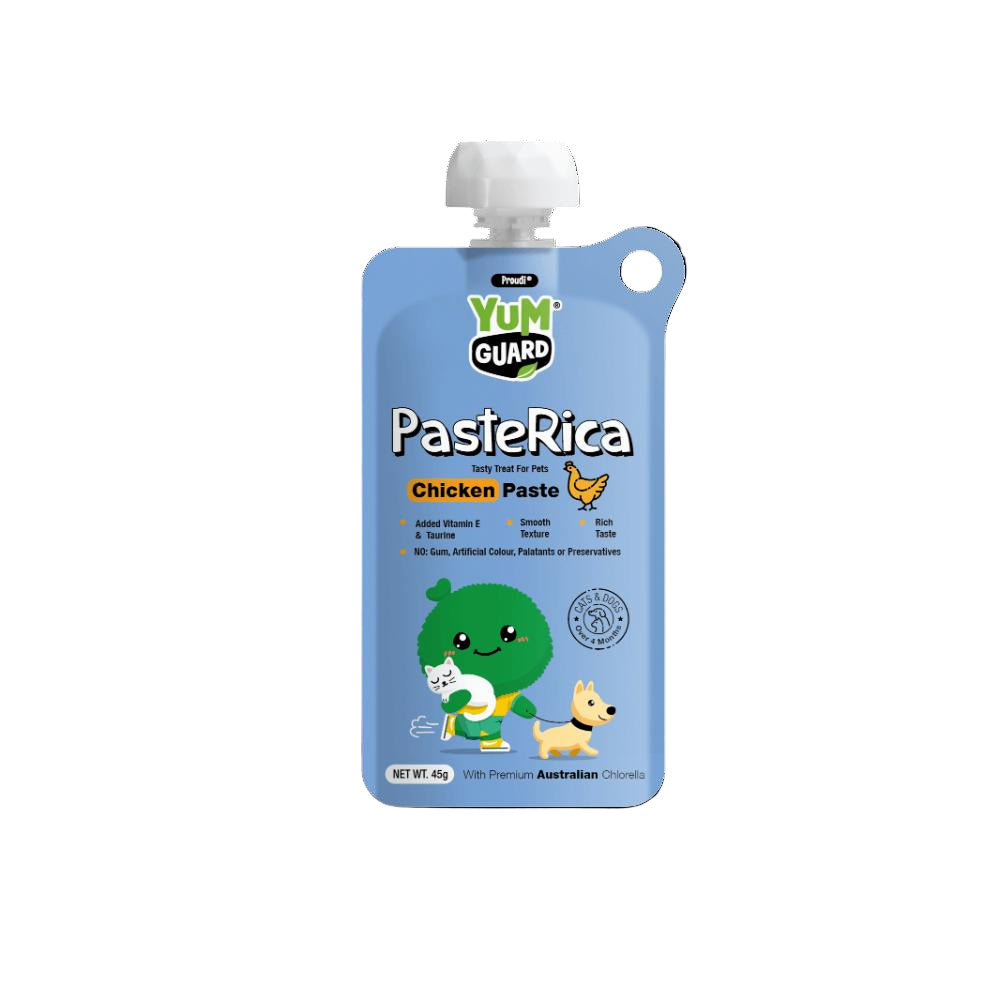Yum Guards Paste Rica is a tasty nutritional treat for cats and dogs that can be enjoyed straight from the pouch. Benefits: Tasty Treat for Cats and Dogs: Yum Guards Paste Rica is a tasty nutritional treat for cats and dogs that can be enjoyed straight from the pouch. Rich in Vitamins and Minerals: Paste Rica is packed with essential vitamins and minerals, including vitamin E, chlorella and Taurine. It contains NO gum, feed attractant, preservatives or artificial colours. Paste Rica and Chlorella: The famous chlorella growth factor is a phenomenon wherein chlorella regularly regenerates its cells to stimulate tissue growth and repair, benefiting your pet at a cellular level. Made with Australian Premium Quality Chlorella! Paste Rica comes in 4 flavours! Check out the other flavours on our website: Ocean Fish, Hake, and Tuna. It has a smooth texture and rich flavour that your pets will go crazy for! Ingredients: Chicken, potato, glycine, chlorella powder, tapioca starch, sunflower seed oil, xylose, cellulose, taurine, vitamin E. Feeding Guide: Use as a complimentary addition to your pets meal. See back of the pack for feeding guide.