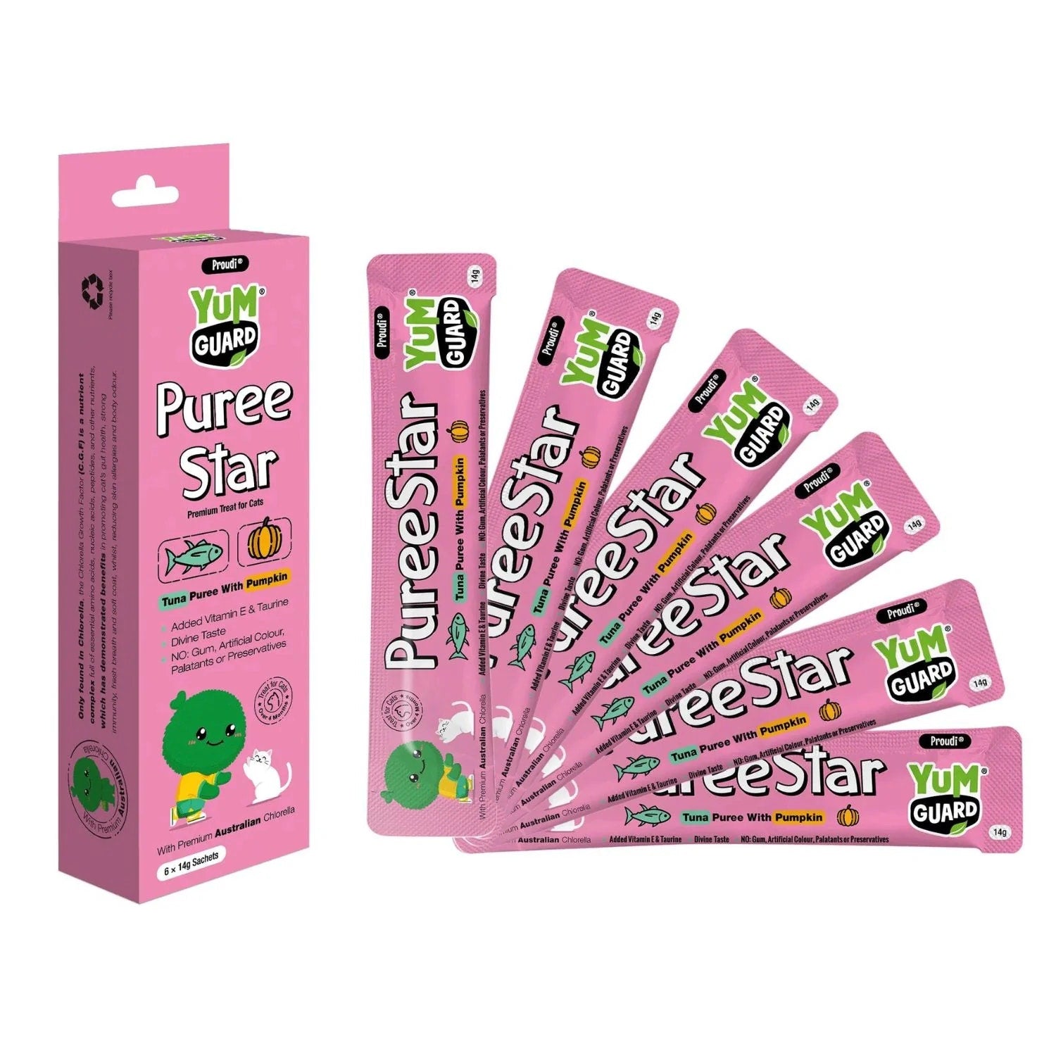 YumGuards Puree Star is a tasty nutritional treat for cats that can be enjoyed straight from the tube or can be squeezed in the bowl as an extra snack. Benefits: Nutritional Snack for Cats: YumGuards Puree Star is a tasty nutritional snack for cats with the benefits of Chlorella.Rich in Vitamins and Minerals: Puree Star is packed with essential vitamins and minerals, including vitamin E, chlorella and Taurine. It contains NO gum, feed attractant, preservatives or artificial colours. Puree Star and Chlorella: The famous chlorella growth factor is a phenomenon wherein chlorella regularly regenerates its cells to stimulate tissue growth and repair, benefiting your pet at a cellular level. Made with Australian Premium Quality Chlorella!Puree Star comes in 4 flavours! Check out the other flavours on our website: Chicken with Cranberry and Blueberry, Chicken with Papaya, and Tuna with Pineapple. It has a smooth texture and rich flavour that your cat will go crazy for!Ingredients:Tuna, potato, pumpkin, glycine, chlorella powder, sunflower seed oil, xylose, taurine, vitamin E. Feeding Guide: Use as a complimentary addition to your pets meal. See back of the pack for feeding guide.