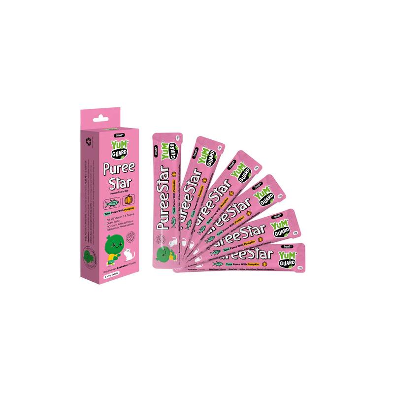 Yum Guards Puree Star is a tasty nutritional treat for cats that can be enjoyed straight from the tube or can be squeezed in the bowl as an extra snack. Benefits: Nutritional Snack for Cats: Yum Guards Puree Star is a tasty nutritional snack for cats with the benefits of Chlorella. Rich in Vitamins and Minerals: Puree Star is packed with essential vitamins and minerals, including vitamin E, chlorella and Taurine. It contains NO gum, feed attractant, preservatives or artificial colours. Puree Star and Chlorella: The famous chlorella growth factor is a phenomenon wherein chlorella regularly regenerates its cells to stimulate tissue growth and repair, benefiting your pet at a cellular level. Made with Australian Premium Quality Chlorella! Puree Star comes in 4 flavours! Check out the other flavours on our website: Chicken with Cranberry and Blueberry, Chicken with Papaya, and Tuna with Pineapple. It has a smooth texture and rich flavour that your cat will go crazy for! Ingredients:Tuna, potato, pumpkin, glycine, chlorella powder, sunflower seed oil, xylose, taurine, vitamin E. Feeding Guide: Use as a complimentary addition to your pets meal. See back of the pack for feeding guide.