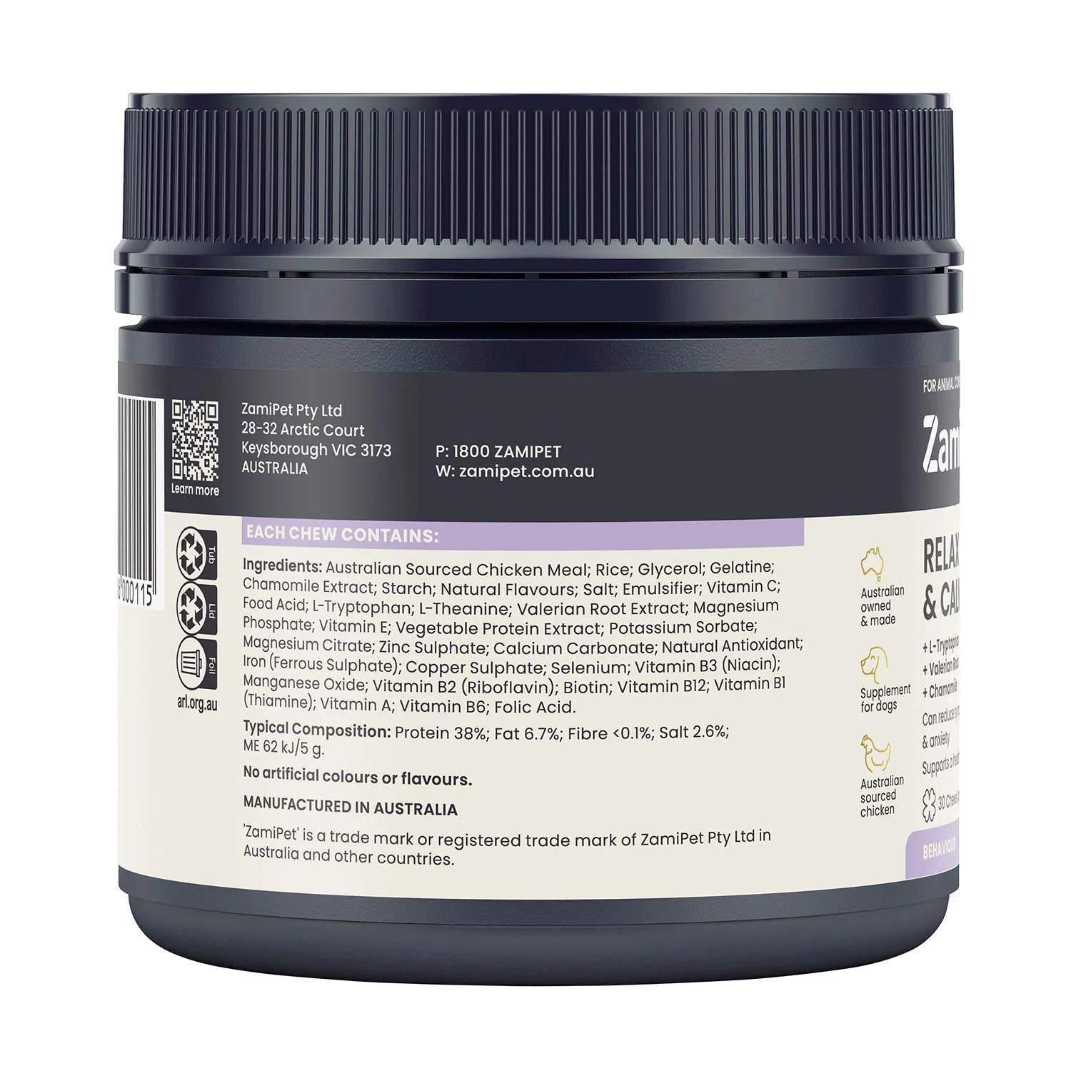Zami Pet Relax & Calm is a great tasting, breakable chew containing L-Tryptophan, Valerian Root, Chamomile and L-Theanine to support a healthy nervous system in dogs and may reduce symptoms of stress and anxiety, without making your pet drowsy.